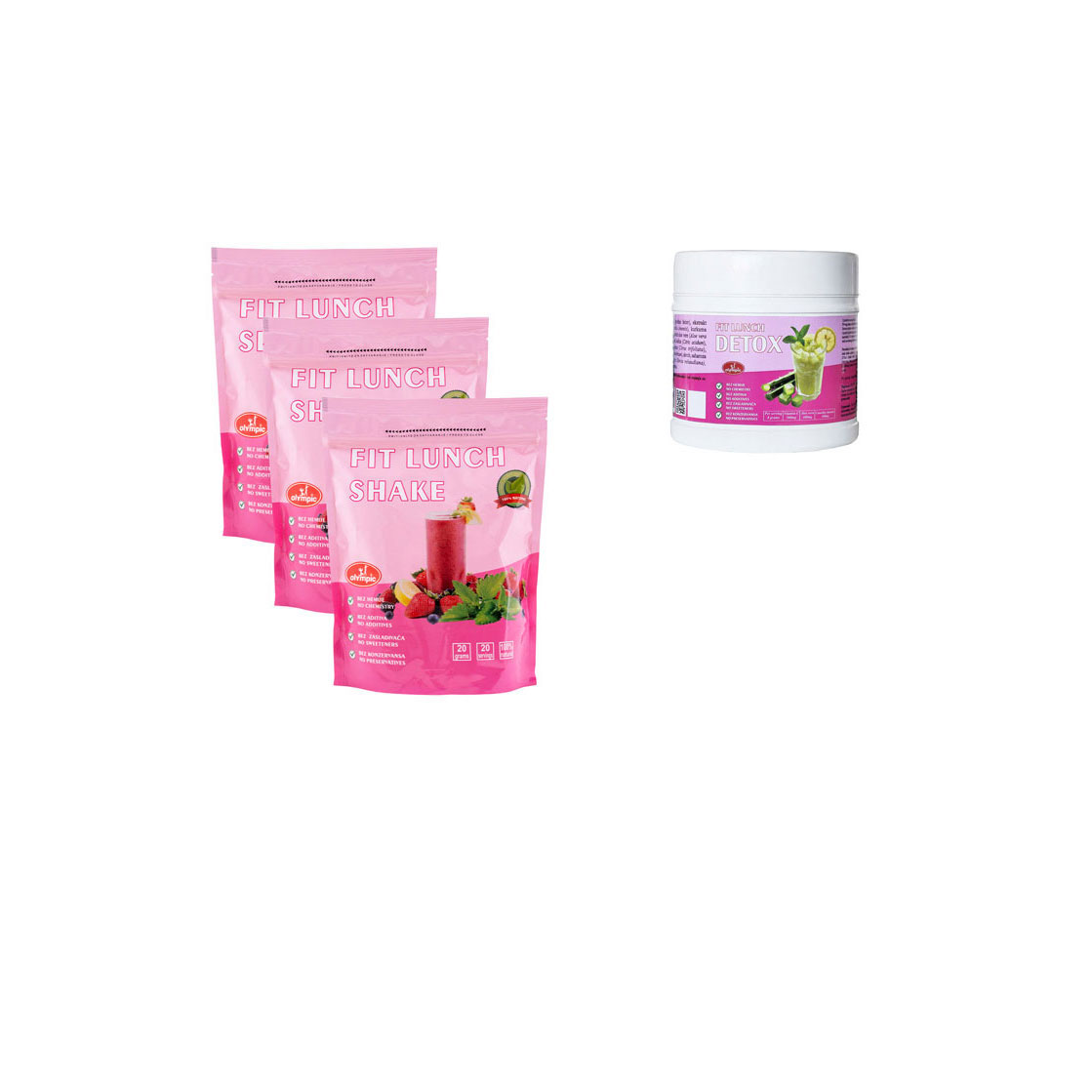 Tj. FitLunch Shake 400 g 3 x 1.200,00 = 3.600,00, FitLunch Collagen 450 g 1 x 1.200,00 = 1.200,00 i FitLunch Detox 360 g 1 x 1.200,00 = 1.200,00, što je u ukupnom zbiru AKCIJSKA CENA 6.000 RSD za pet proizvoda.